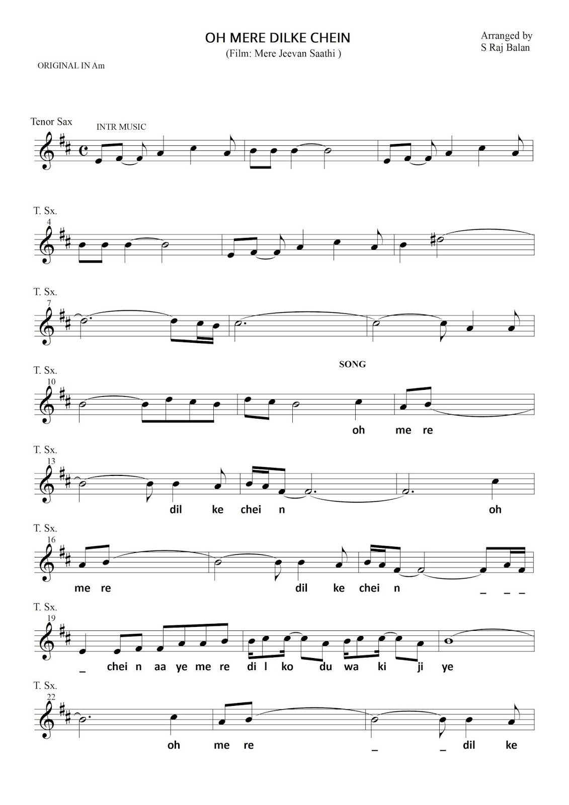 R D BURMAN SONGS SHEET MUSIC FOR TENOR SAXOPHONE